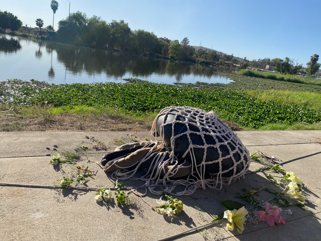 un dispositivo flotante conformado por una cámara de llanta y tentáculos hechos con medias recicladas rellenas de cabello humano y otros ingredientes con la promesa de absorver alguna cantidad de contaminantes del río santiago en juanacatlán jalisco.